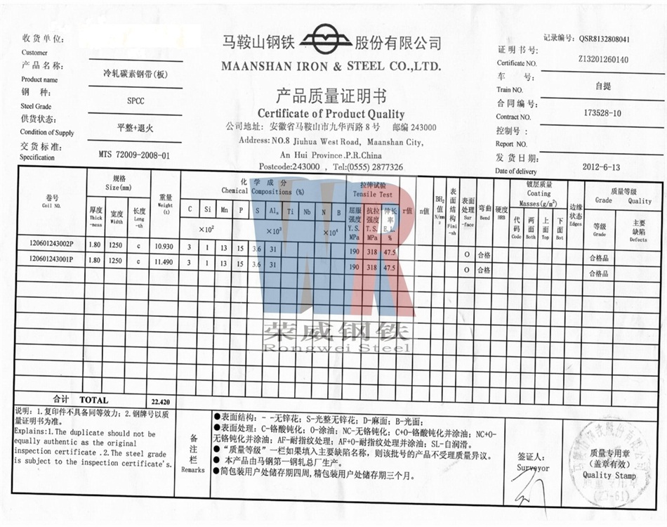 2.上海荣威--日本新日铁深冲冷轧卷1.0 和1.2-1249SPCEN